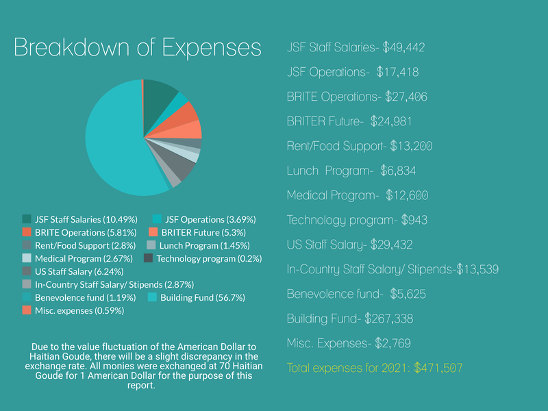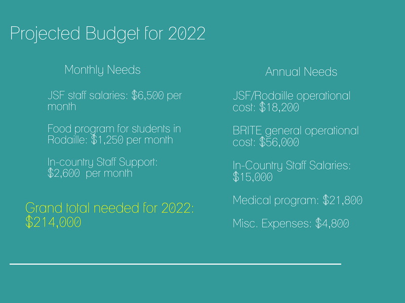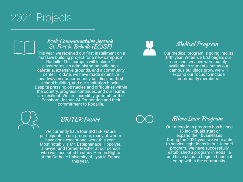 Thanks to a partnership with Penshorn Joshua 24 foundation, we have begun construction on a new campus in Rodaille. This campus will include 12 classrooms, an administration building, a cafeteria, large extensive grounds, and a community center. The community center will hold our clinic, pharmacy, library, computer center, and a financial co-op for the community microloan program. We are truly grateful for the Penshorn Joshua 24 Foundation and its generosity and commitment to Rodaille. We cannot wait to see what 2021 brings for the community of Rodaille.