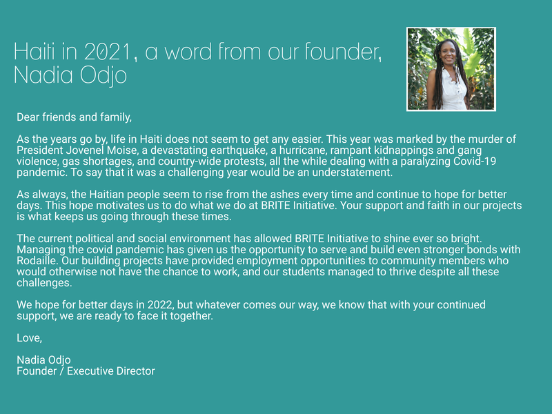 She is heavily engaged in volunteering work. She has volunteered with various non-profit organizations throughout the years in the United States and in Haiti as well. She heard about the Odjo's work in Haiti and had a chance to visit Jacmel in 2020 and was in awe of all the work BRITE was doing in the community of Rodaille. She witnessed first-hand the amazing work that BRITE is doing for that community; improving people’s lives through education as well as through health and social services. Regina admires BRITE’s vision and its mission.