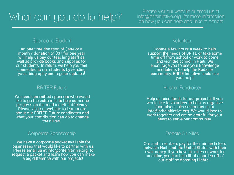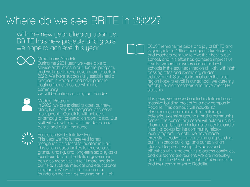 She spent six years helping BRITE grow, and in 2019 she decided it was time to move stateside to help BRITE grow in the areas of fundraising, donor relations, volunteer recruitment, and long-term goals. She is the current Director of Operations and loves helping BRITE continue to serve the people of Rodaille and Haiti's greater south-east region.